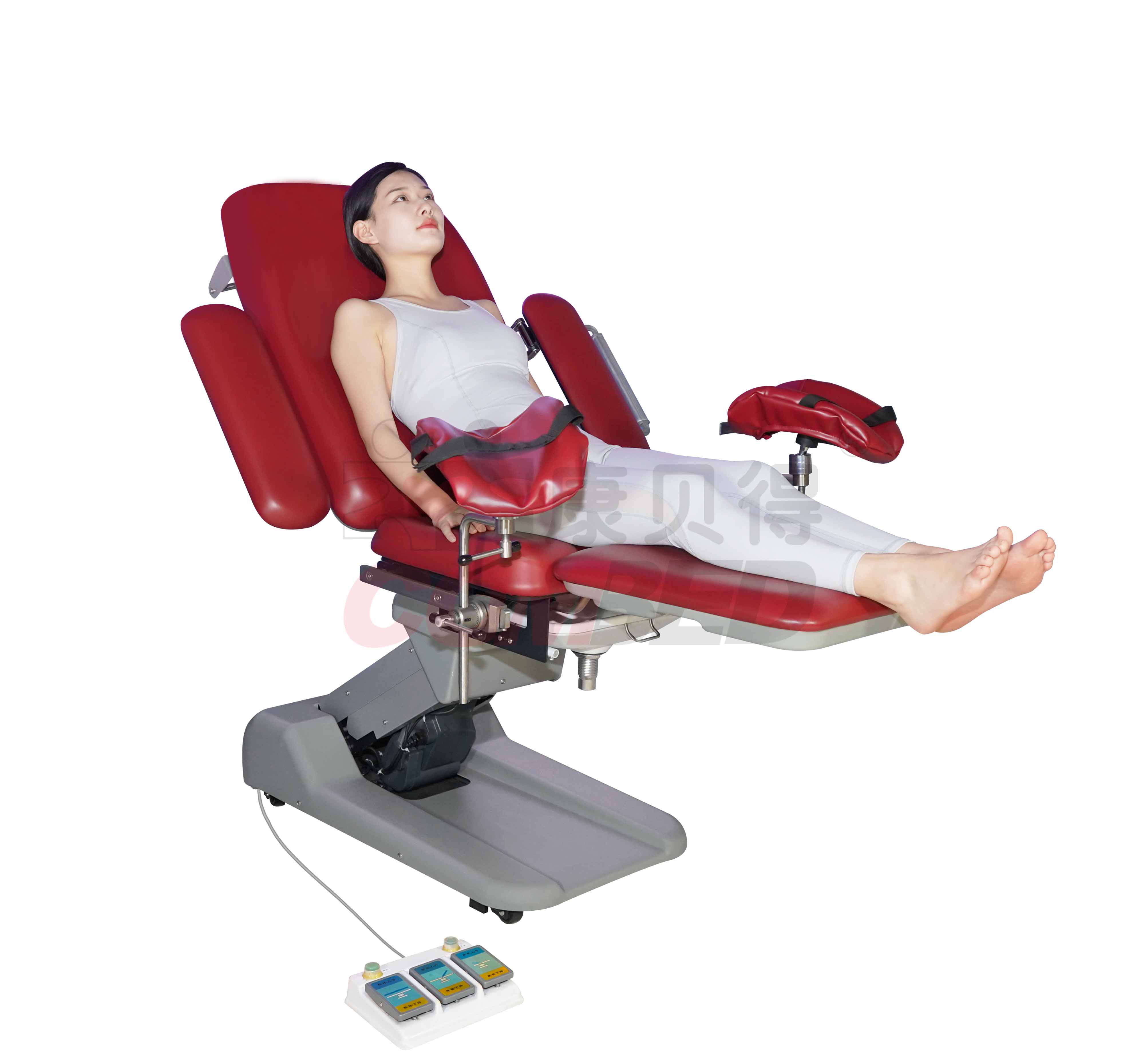 DH-S102D电动妇科手术台整体升降、背板、臀板折转为电动操作,搁腿架可手动调节,配有可脱卸辅助台,该床供妇产科施行一般手术用。